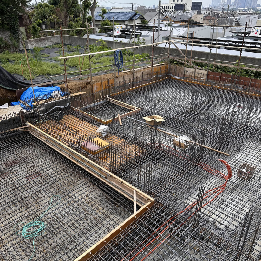 地下1階のスラブ配筋検査の工程に入っています。地下の大きさが実感できるようになってきています。