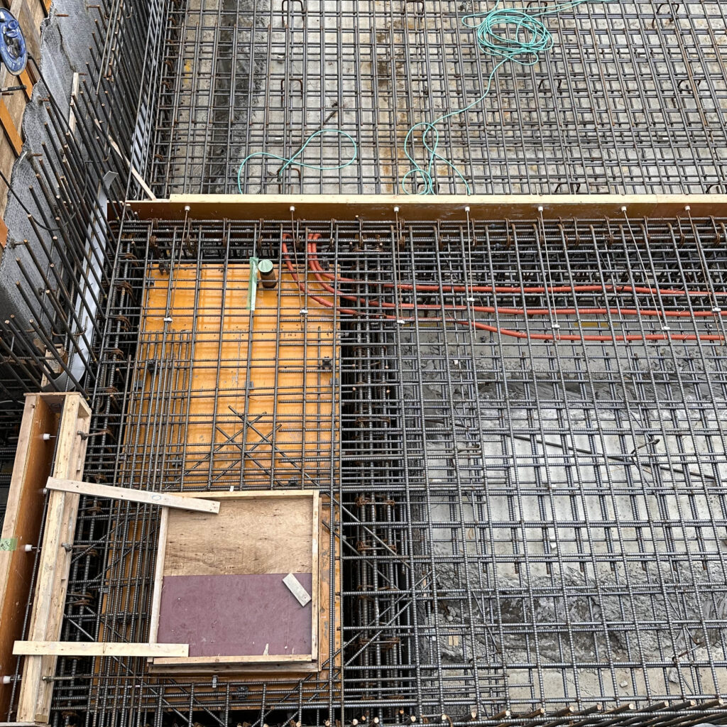 地下ピット部分の開口部分には斜めに鉄筋を入れて補強を行います。