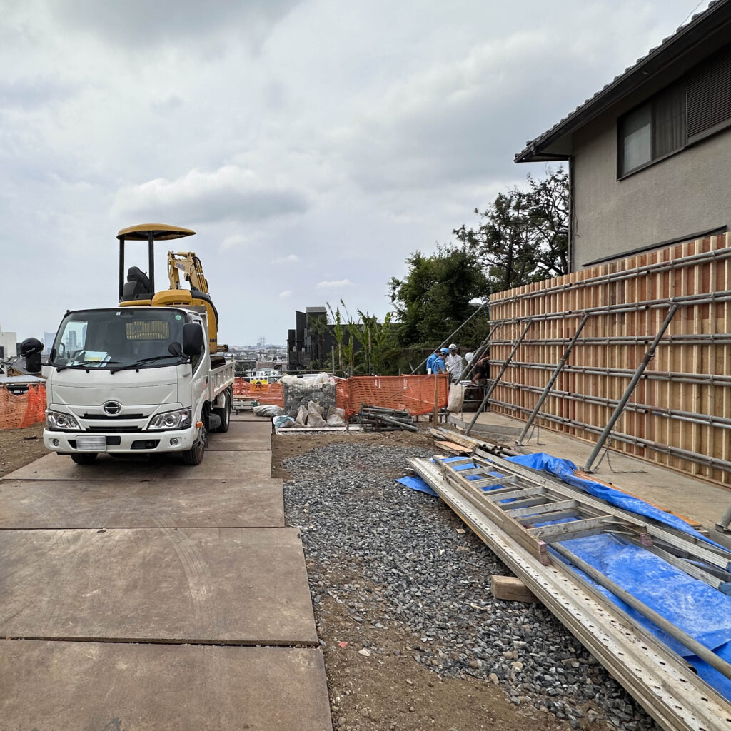 隣地境界部分にコンクリートの塀を2.1m立ち上げるので本体工事に先立ち打設していく予定です。