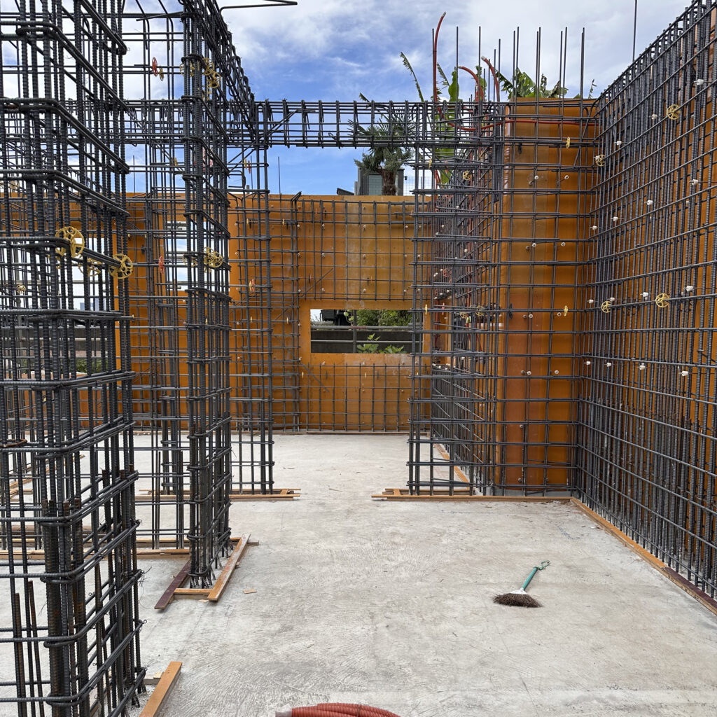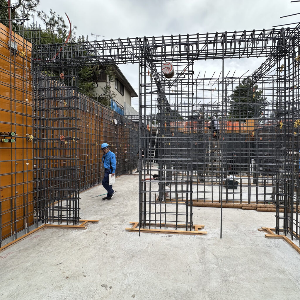 地下1階のスラブのコンクリート打設を終えて、壁の配筋、型枠工事へ進んでいます。