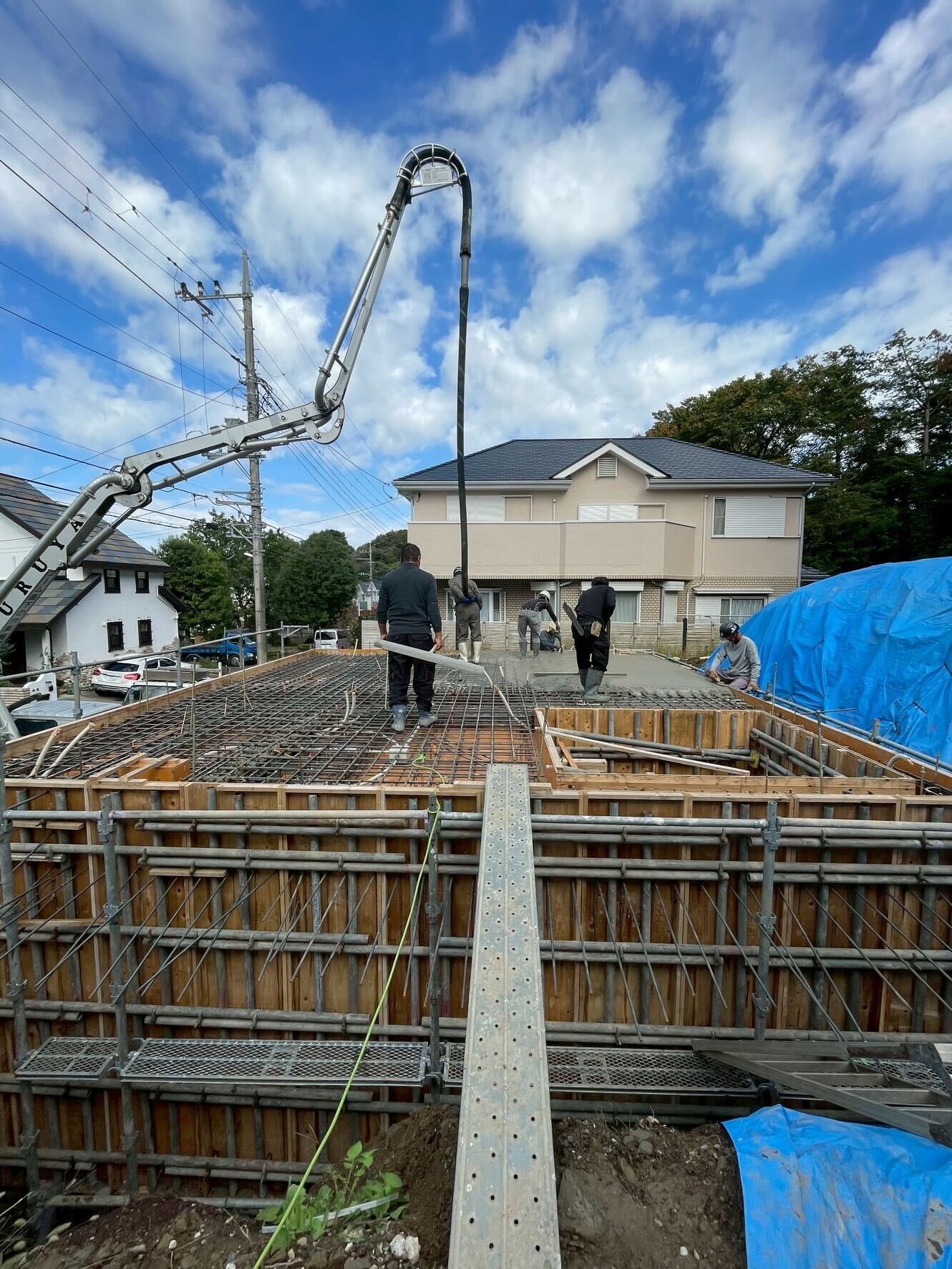 地下天井の配筋が終わり、コンクリートの打設が始まりました。